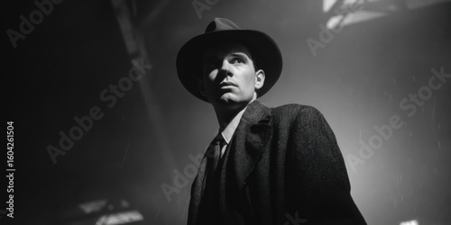 Mysterious Encounter: A noir-esque figure, bathed in dramatic lighting, projects an aura of intrigue. His posture and gaze hint at a tale yet untold.