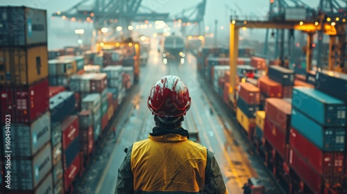 A worker in an orange hard hat and safety vest is seen from behind, overlooking a vast port with shipping containers and cranes, symbolizing global logistics and trade