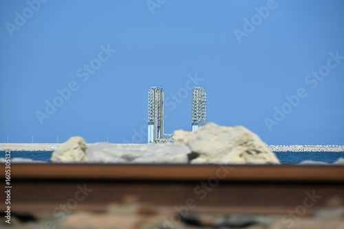 platforma załadunkowa ogromne dźwigi w porcie niebieskie niebo