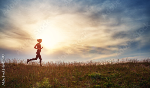 Young woman running on the field near seaside at sunset. Active person outdoors at the dusk in summer