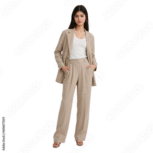 Elegant woman in a beige pantsuit posing gracefully on an isolated neutral setting fashion statement