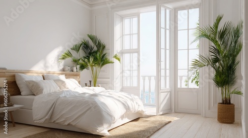 airy summer bedroom interior, white linens, open balcony doors, sunlight streaming in, indoor palm plants, coastal minimal decor, light wooden accents