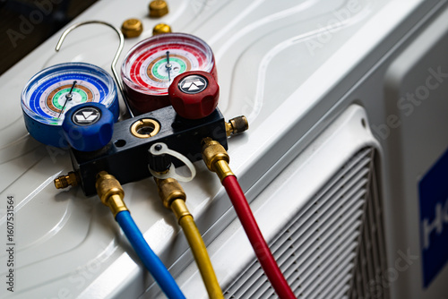 Refrigerant Manifold Gauges Connected to AC Unit