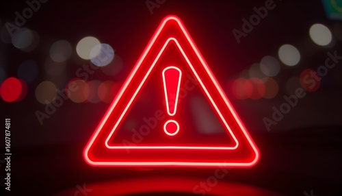 Urgent Red Neon Warning Triangle with Exclamation Mark Illuminates Dark Background, Symbolizing Critical Hazard, System Error, and Digital Danger Alert.