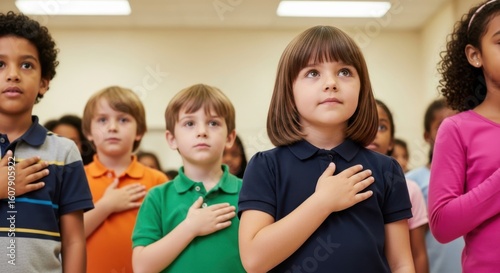 3d rendering of diverse children reciting pledge of allegiance in classroom