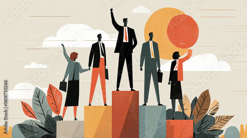 Biznesmen z pucharem stojący na podium - ilustracja symbolizująca sukces zawodowy, motywację i osiągnięcie celu