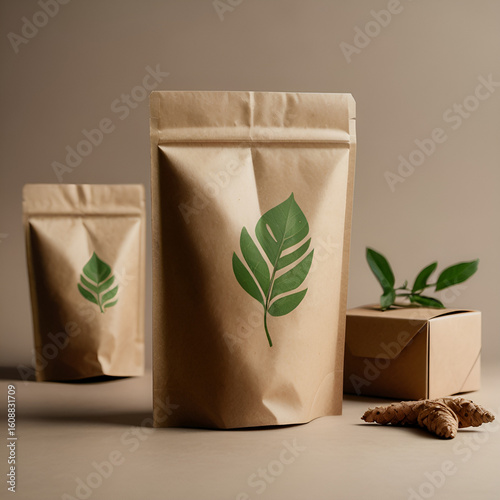 Kraft paper packaging with greenery, ideal for sustainable product branding, mockups, and eco-conscious campaigns.