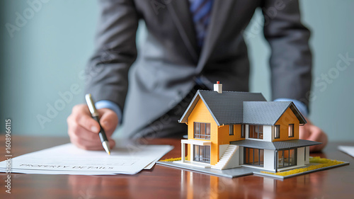 Businessman in a suit signing a real estate contract with a model house on the desk, representing a property purchase or mortgage deal.