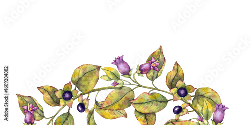 Watercolor botanical illustration belladonna, Atropa belladonna with flowers and dark berries banner. for educational medical pharmaceutical mystical or Halloween for illustrating danger toxicity.