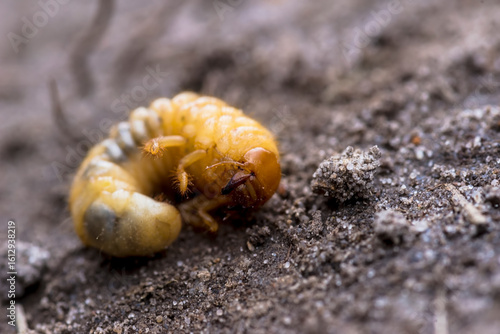 Pędrak– świeżo wykopana larwa chrząszcza majowego (Melolontha melolontha). Skręcona, żółtawa larwa o segmentowanym ciele leży na brązowej, luźnej glebie. Głowa jest ciemniejsza i posiada małe, widoczn