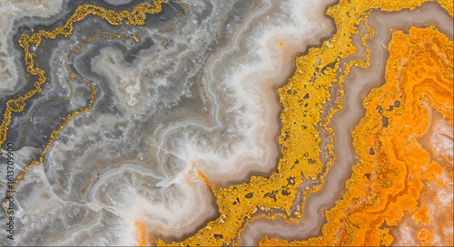 Abstract agate stone pattern showcasing gray, white, and vibrant orange colors with gold accents