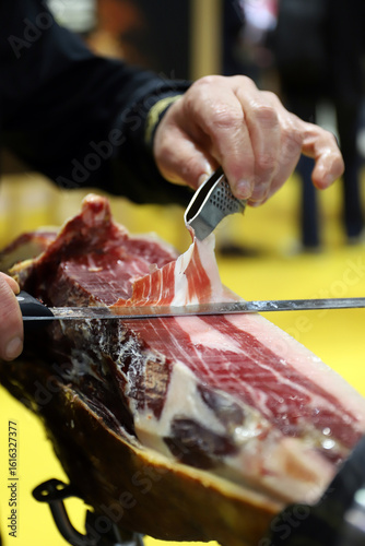 experto en cortar jamón cortando una loncha de un jamón ibérico con un cuchillo de corte y herramientas de maestro jamonero