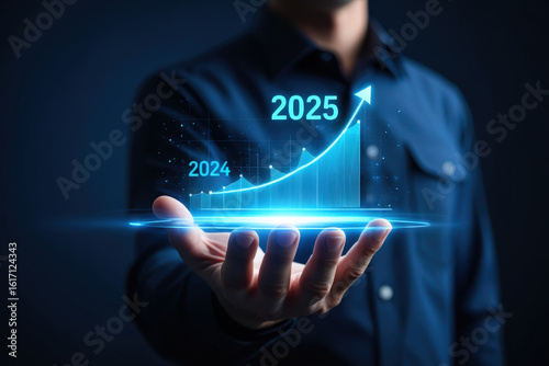 Visualizing Growth and Progress A Hand Holding a Holographic Graph Displaying an Upward Trend from 2024 to 2025 Representing Business Success and Future Projections
