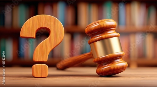 A wooden judge's gavel lies next to a large wooden question mark on a desk, symbolizing legal uncertainty or questions about justice.