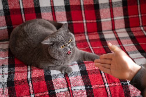 Angry grey cat hisses at a person trying to pet it. Cat arches its back and hisses in response to an approaching hand