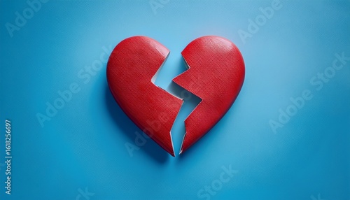 a red broken heart heartbreak sadness loss and emotional pain isolated on a solid blue background