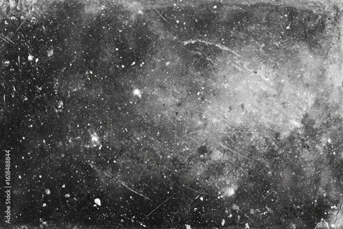 A grayscale image depicting a heavily textured surface with scratches, dust, and light speckles, suggesting age and wear, creating a distressed, vintage aesthetic