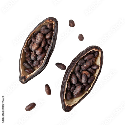 Fresh Open and Whole Cacao Pods with Beans Isolated on White Background