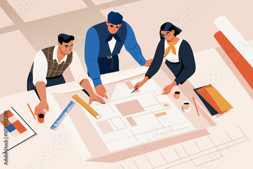 Zespół architektów i inżynierów współpracuje przy projekcie, analizując plan budowlany.