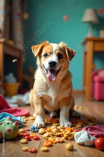 Hilarious family chaos unfolds as a playful dog creates utter pandemonium amidst a pile of laundry, toys, and spilled snacks Pure comedic gold for any family-themed project!, happiness, playful