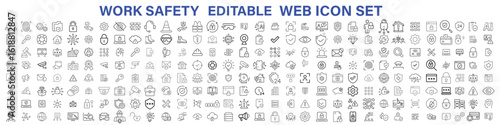 Work Safety editable stroke outline web icons set. Safety first, hazard, protection, health, insurance, regulations, helmet and work. Vector illustration