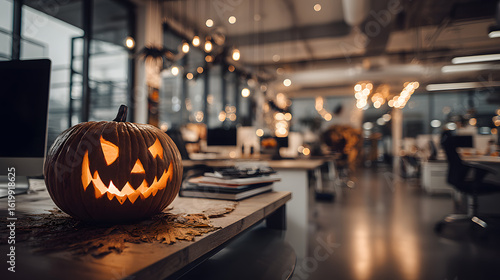 A festive Halloween-themed office with a carved pumpkin jack-o'-lantern glowing brightly on a desk amidst modern interiors and the seasonal decor around