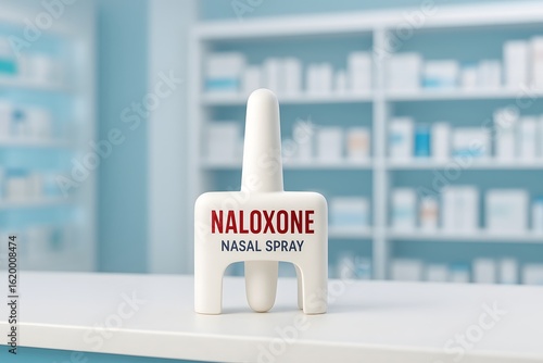 high-quality image of naloxone nasal spray placed on a white pharmacy counter with medication shelves in the background—ideal for addiction treatment, harm reduction, or public health campaigns