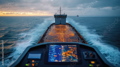 Autonomous shipping vessel dashboard powered by AI with route mapping, cargo status, environmental data, and predictive collision avoidance interface