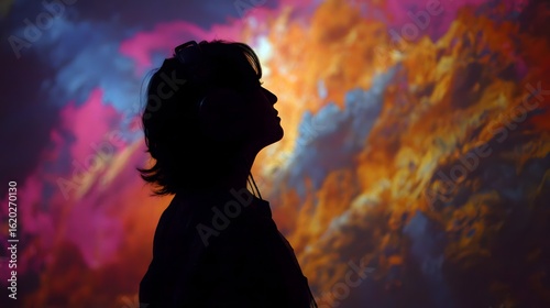 #1303721574Artistic Silhouette: A creatively composed silhouette of a parent and baby in arms against a vibrant background, adding an artistic flair to the scene