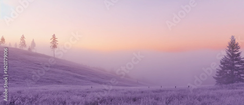 Fog-draped hillside with scattered pine trees and a pale lavender sunrise behind