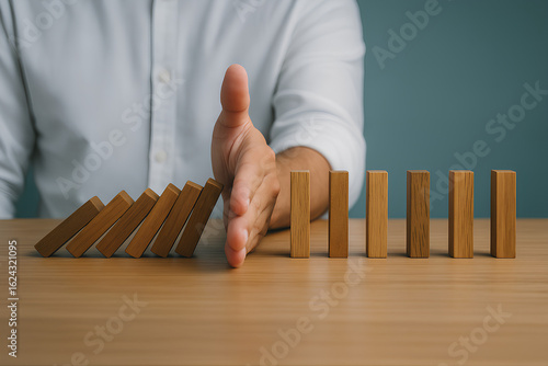 A hand stops falling dominoes, symbolizing prevention, control, and risk management.