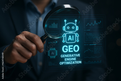 GEO – Generative Engine Optimization concept with businessmen using agentic AI and digital assistants to boost search engine rankings through artificial intelligence and internet data technology