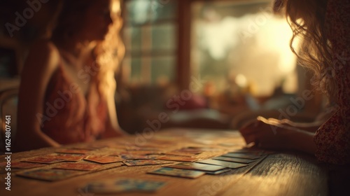 A woman spreads metaphorical cards across the table, caught in a sacred gesture of intuitive flow and emotional-spiritual clarity.