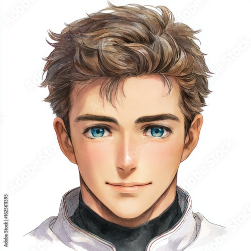 Anime-Porträt eines jungen Mannes mit braunen Haaren und blauen Augen – Detailliertes digitales Charakterdesign im Manga-Stil