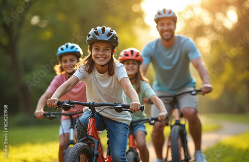 Joyful family, mom, dad, two children, ride bicycles in park during summer. Wear helmets, smile, embracing active lifestyle, family bonding. Trees, green grass surround on sunny day, creating warm