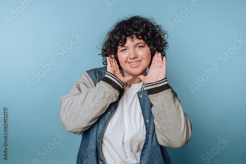 portrait of young woman smiles while posing as if listening, showcasing a playful and upbeat personality on blue background