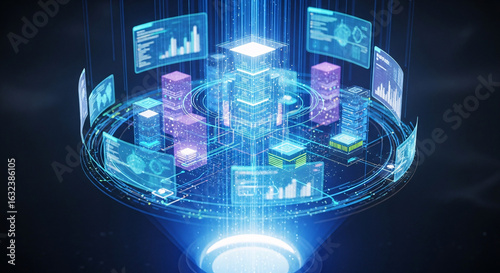Futuristic holographic data hub with glowing blue towers and floating analytical dashboards displaying charts and graphs.