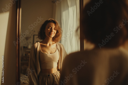 Dziewczyna uśmiecha się do siebie w lustrze tuż po przebudzeniu. To jej codzienny rytuał, który pomaga zacząć dzień z pozytywną energią i pewnością siebie.