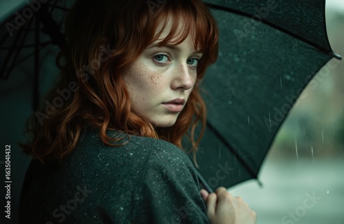 Redhead woman with freckles, holding dark umbrella in rain. Looking over shoulder, wet hair, moody atmospheric style. Green jacket, intense gaze, feminine allure, cinematic portrait.