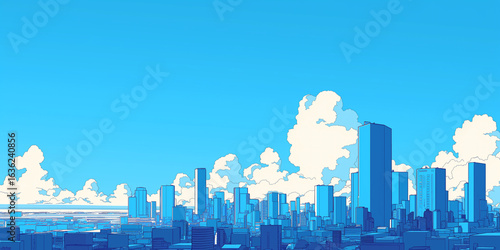 雲ひとつない青空と、光を反射する高層ビルを手描きで表現した都市風景イラスト。ビジネス街、オフィス街、街並み、近代建築、青空背景、広告やパンフレット用素材にも適合。