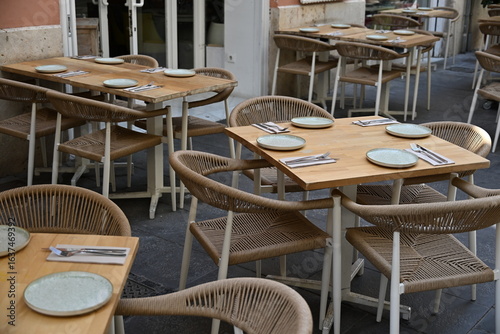 drewniane stoły i wiklinowe krzesła puste w restauracji czekają na gości