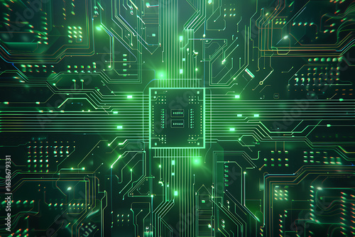 中央にチップが配置された緑色の電子回路基板の背景