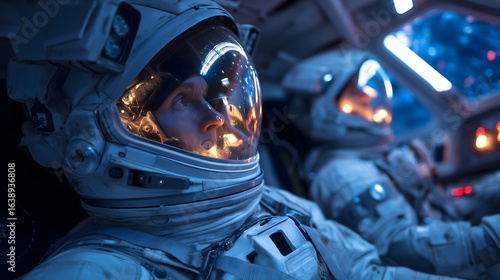Close-Up of Astronauts Inside Spacecraft Cockpit, Wearing Space Suits and Helmets During Space Mission Launch