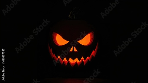An ominous Halloween pumpkin light featuring glowing eyes and a frightening face in darkness.