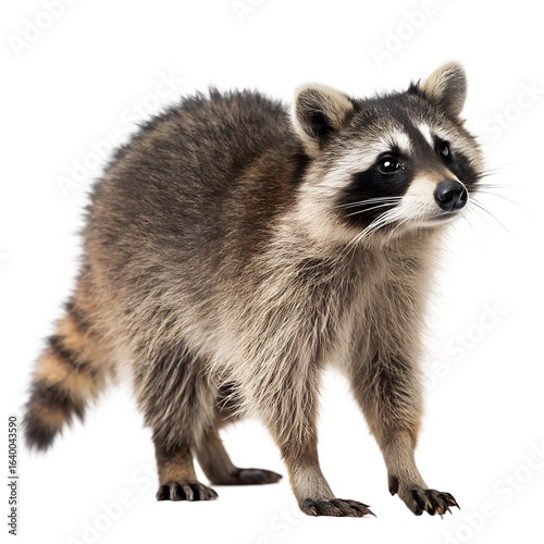 A raccoon stands on its hind legs, showcasing its distinctive black mask and bushy tail. The animal has gray fur and a curious expression, typical of its species.