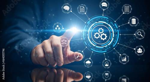 A hand interacts with a holographic generative icon, suggesting advanced tech.| tools for reorganization and uploading files to a file directory. | Futuristic Holographic Generative icon