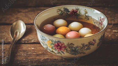 Tangyuan sweet glutinous rice balls in floral bowl traditional chinese dessert food photography still life