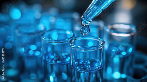 Close-up of blue liquid in test tubes with dropping effect - High-resolution lab photography for science ads and education