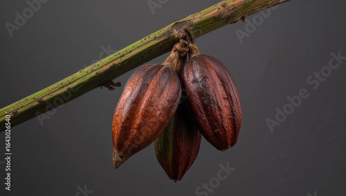 Cocoa pods hanging from a branch, a closeup view on a dark gray background.