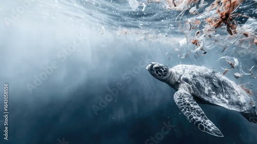 A turtle tangled in plastic rings underwater, struggling to swim, murky polluted ocean, heartbreaking wildlife scene